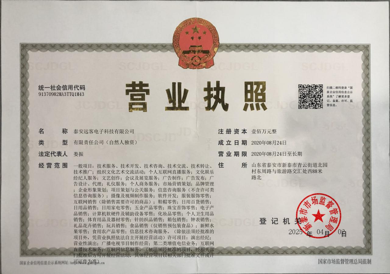 泰安遠(yuǎn)客電子科技有限公司是一家從事技術(shù)服務(wù),技術(shù)開(kāi)發(fā),技術(shù)咨詢等業(yè)務(wù)的公司,成立于2020年08月24日,公司坐落在山東省,詳細(xì)地址為:山東省泰安市新泰市青云街道北園村東周路與旅游路交匯處西88米路北;經(jīng)國(guó)家企業(yè)信用信息公示系統(tǒng)查詢得知,泰安遠(yuǎn)客電子科技有限公司的信用代碼/稅號(hào)為91370982MA3TTQ1M43,法人是婁振,注冊(cè)資本為100.000000萬(wàn),企業(yè)的經(jīng)營(yíng)范圍為:一般項(xiàng)目:技術(shù)服務(wù)、技術(shù)開(kāi)發(fā)、技術(shù)咨詢、技術(shù)交流、技術(shù)轉(zhuǎn)讓、技術(shù)推廣;組織文化藝術(shù)交流活動(dòng);個(gè)人互聯(lián)網(wǎng)直播服務(wù);文化娛樂(lè)經(jīng)紀(jì)人服務(wù);文藝創(chuàng)作;會(huì)議及展覽服務(wù);廣告制作;廣告發(fā)布;廣告設(shè)計(jì)、代理;禮儀服務(wù);個(gè)人商務(wù)服務(wù);市場(chǎng)營(yíng)銷策劃;品牌管理;企業(yè)形象策劃;項(xiàng)目策劃與公關(guān)服務(wù);信息咨詢服務(wù)(不含許可類信息咨詢服務(wù));攝像及視頻制作服務(wù);軟件開(kāi)發(fā);服裝服飾零售;互聯(lián)網(wǎng)銷售(除銷售需要許可的商品);鞋帽零售;日用百貨銷售;日用品銷售;日用家電零售;五金產(chǎn)品零售;珠寶首飾零售;電子產(chǎn)品銷售;計(jì)算機(jī)軟硬件及輔助設(shè)備零售;化妝品零售;個(gè)人衛(wèi)生用品銷售;體育用品及器材零售;針紡織品銷售;箱包銷售;鐘表銷售;禮品花卉銷售;玩具銷售;食品銷售(僅銷售預(yù)包裝食品);新鮮水果零售;食用農(nóng)產(chǎn)品零售;信息技術(shù)咨詢服務(wù)。(除依法須經(jīng)批準(zhǔn)的項(xiàng)目外,憑營(yíng)業(yè)執(zhí)照依法自主開(kāi)展經(jīng)營(yíng)活動(dòng))許可項(xiàng)目:演出經(jīng)紀(jì);營(yíng)業(yè)性演出;廣播電視節(jié)目制作經(jīng)營(yíng);第二類增值電信業(yè)務(wù);互聯(lián)網(wǎng)直播技術(shù)服務(wù);互聯(lián)網(wǎng)信息服務(wù)。(依法須經(jīng)批準(zhǔn)的項(xiàng)目,經(jīng)相關(guān)部門(mén)批準(zhǔn)后方可開(kāi)展經(jīng)營(yíng)活動(dòng),具體經(jīng)營(yíng)項(xiàng)目以相關(guān)部門(mén)批準(zhǔn)文件或許可證件為準(zhǔn))